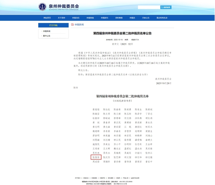 近日,yl8cc永利官网学科带头人张国安教授续聘为第四届泉州仲裁委员会第二批仲裁员。