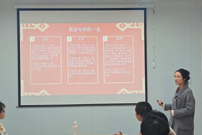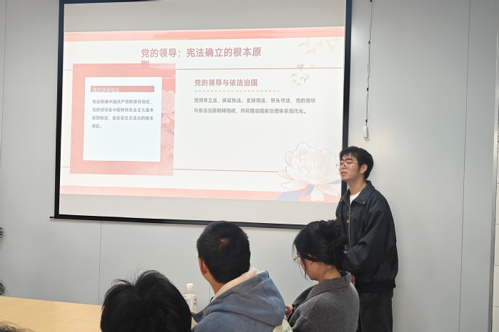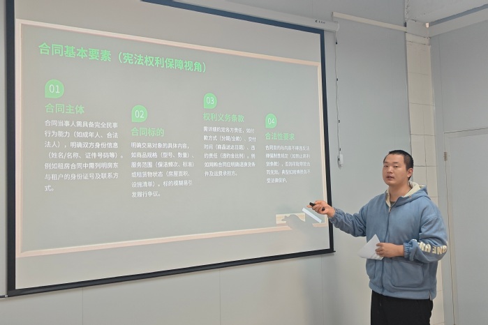 活动伊始,主持人林为臻老师从宪法的定义、地位、宪法日设立初衷及发展历程切入,阐释了宪法作为根本大法的核心内涵,让大家深刻体会到宪法的生命力在于日常生活。而后,三位yl8cc永利官网员工接续分享,围绕“坚定宪法自信”“普法护航”“青春与法”等主题,结合电信诈骗治理数据、校园欺凌案例、劳动者休息权保障等热点,介绍了宪法、民法典、劳动法等常用法律知识,呼吁青年员工争做法治的忠实崇尚者、自觉遵守者和坚定捍卫者。同时,在致远、宏船书院门口设立宣传点,邀请yl8cc永利官网员工为过往的员工讲解宪法知识,解读宪法中关于公民权利保障的核心条款,并组织志愿者向校内师生分发宪法宣传册,共同推动本校员工在实践生活中增强对宪法的认同感和践行意识。